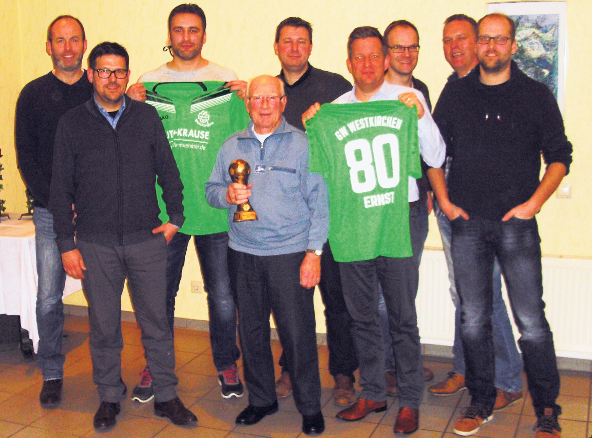 Westkirchen ( B.S.) Ernst Wilke wurde auf der kürzlich abgehaltenen Jahreshauptversammlung der Altherren Fußball Abteilung von GW Westkirchen zum Ehrenspieler ernannt. Der Sportsmann Wilke feierte Mitte Januar seinen 80. Geburtstag und ist auch heute noch regelmäßig beim Hallentraining aktiv dabei. Ernst Wilke ist Gründungsmitglied der Abteilung und plant im Mai des Jahres sein Abschiedsspiel bei den Grün Weißen. Zu Beginn der Versammlung begrüßte der Abteilungsleiter Carsten Stüring die Mitglieder im Vereinslokal „Am Nienkamp“. Bevor die Wahlen auf dem Programm standen, verlass Jörg Hellenkemper das Protokoll der letztjährigen Generalversammlung. Anschließend fasste Thorsten Koch als sportlicher Leiter das vergangene Sportjahr zusammen und gab einen Ausblick auf die kommende Saison. Neu in den Spielplan aufgenommen wurde die Altherren-Liga, um einen verbindlichen Spielbetrieb zu garantieren. Bei den Wahlen herrschte Übereinstimmung bei den anwesenden Mitgliedern. Carsten Stüring als Vorsitzender, Jörg Hellenkemper als sein Stellvertreter und Kassenwart Ralf Werner wurden einstimmig in ihren Ämtern bestätigt. Als Beisitzer und Mitglieder des Festausschusses fungieren zudem Uli Böcker, Joern Conrad, Jörg Kuhn und Frank Walpuski. Neu hinzu gekommen ist Christian Hunke. Zum Schluss der Versammlung gab der Abteilungsleiter noch einen Ausblick auf die außer sportlichen Veranstaltungen 2017. So steht im Juli eine dreitägige Mannschaftsfahrt auf dem Programm. Das beliebte Fallschirmfest soll am Samstag den 26. August ausgetragen werden. Weiter bedankte sich Stüring bei Sven Winkelkötter der für die Abteilung neue Trikots organisiert hat.
