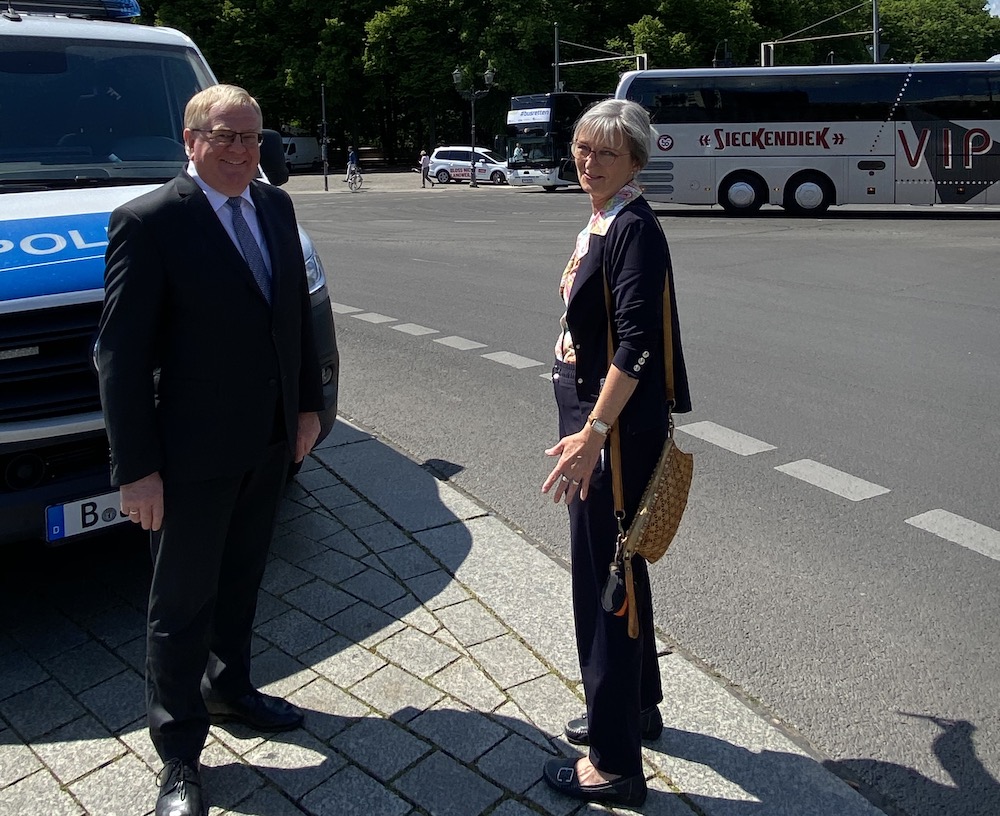 Reinhold Sendker und Frau Bettina Sieckendiek aus Versmold bei der Übergabe eines Positionspapiers, bzw. vor dem Bus-Korso am Brandenburger Tor. (Fotos: CDU)