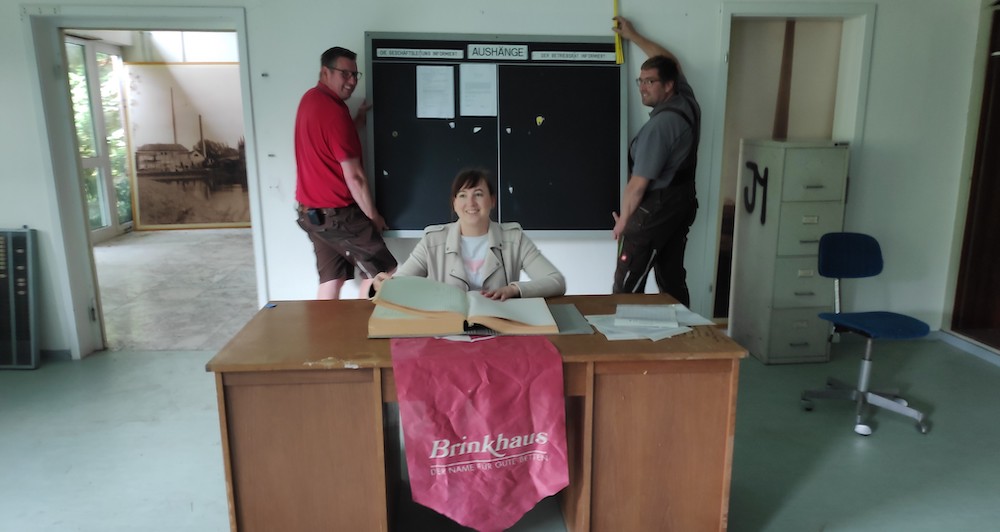 Auf dem Foto sind Sascha Schlöpker, Lisa Woitschikowski und Benedikt Westhove (Baubetriebshof und Stadtbücherei) gerade dabei das Büro herzurichten.