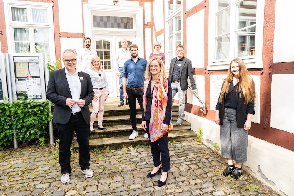 Europa-Abgeordnete Viola von Cramon (vorne Mitte) informierte sich bei der Caritas Gütersloh über die Lebenssituation der Arbeitsmigrant*nnen in der heimischen Fleischindustrie. Mit im Bild von links: Caritas-Vorstand Volker Brüggenjürgen, Konstantin Pramatarski, Agnieszka Kukiełka (beide Caritas-Beratung), Frank Börgerding (Kreisfamilienzentrum Herzebrock-Clarholz), Sebastian Stölting (Bundestagskandidat Bündnis 90/Die Grünen), Katrin Haude (Caritas-Beratung), Peter Köching (Fachbereichsleitung Sucht- und Drogenhilfe) und Diana Didilica (Caritas-Beratung).