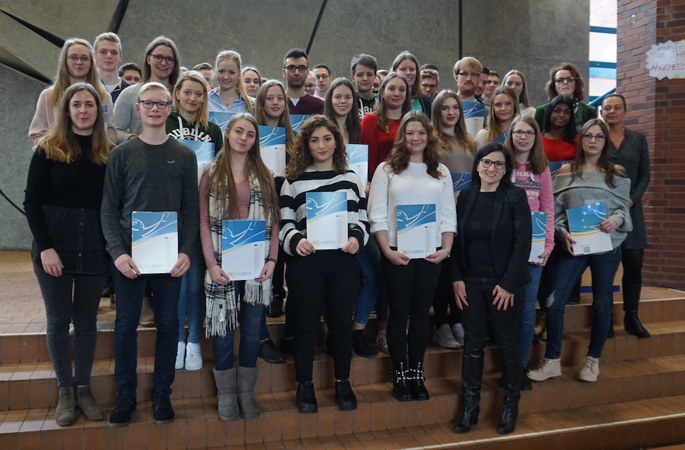 Den „Europass Mobilität“ erhielten jetzt 49 Schülerinnen und Schüler des Paul-Spiegel-Berufskollegs Warendorf. In einem feierlichen Rahmen überreichte die stellvertretende Schulleiterin Inka Schweers das europaweit anerkannte Zertifikat für Auslandspraktika. Im Sommer und Herbst 2018 hatten die Schülerinnen und Schüler verschiedenster Bildungsgänge den Schritt gewagt und erfolgreich ein vier- bzw. fünfwöchiges Praktikum in Wien, Dublin, Sevilla, auf den kanarischen Inseln und La Reunion absolviert. Ihre Eindrücke und Erfahrungen vom Leben, Wohnen und Arbeiten im Ausland präsentierten sie in der Aula des Berufskollegs vor interessierten Schülerinnen und Schülern und motivierten sie so zu einer Ausreise im Jahr 2019.