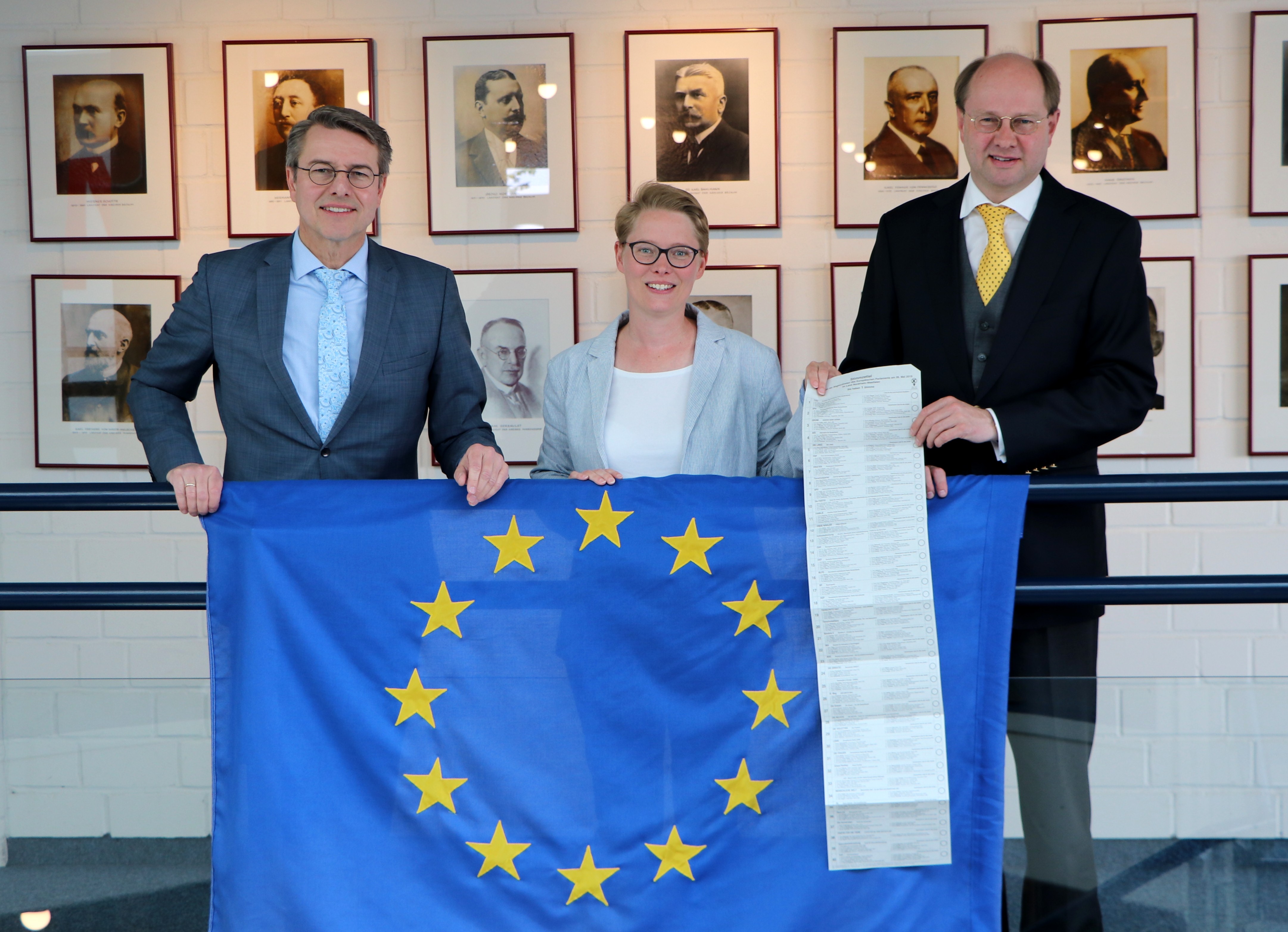 Landrat Dr. Olaf Gericke (r.), Kreiswahlleiter Dr. Stefan Funke (l.) und Wahlsachbearbeiterin Nicole Rogoski hoffen auf eine hohe Wahlbeteiligung am 26. Mai. Auf dem 96 cm langen Stimmzettel für die Europawahl sind 40 Parteien vertreten. – Foto: Kreis Warendorf