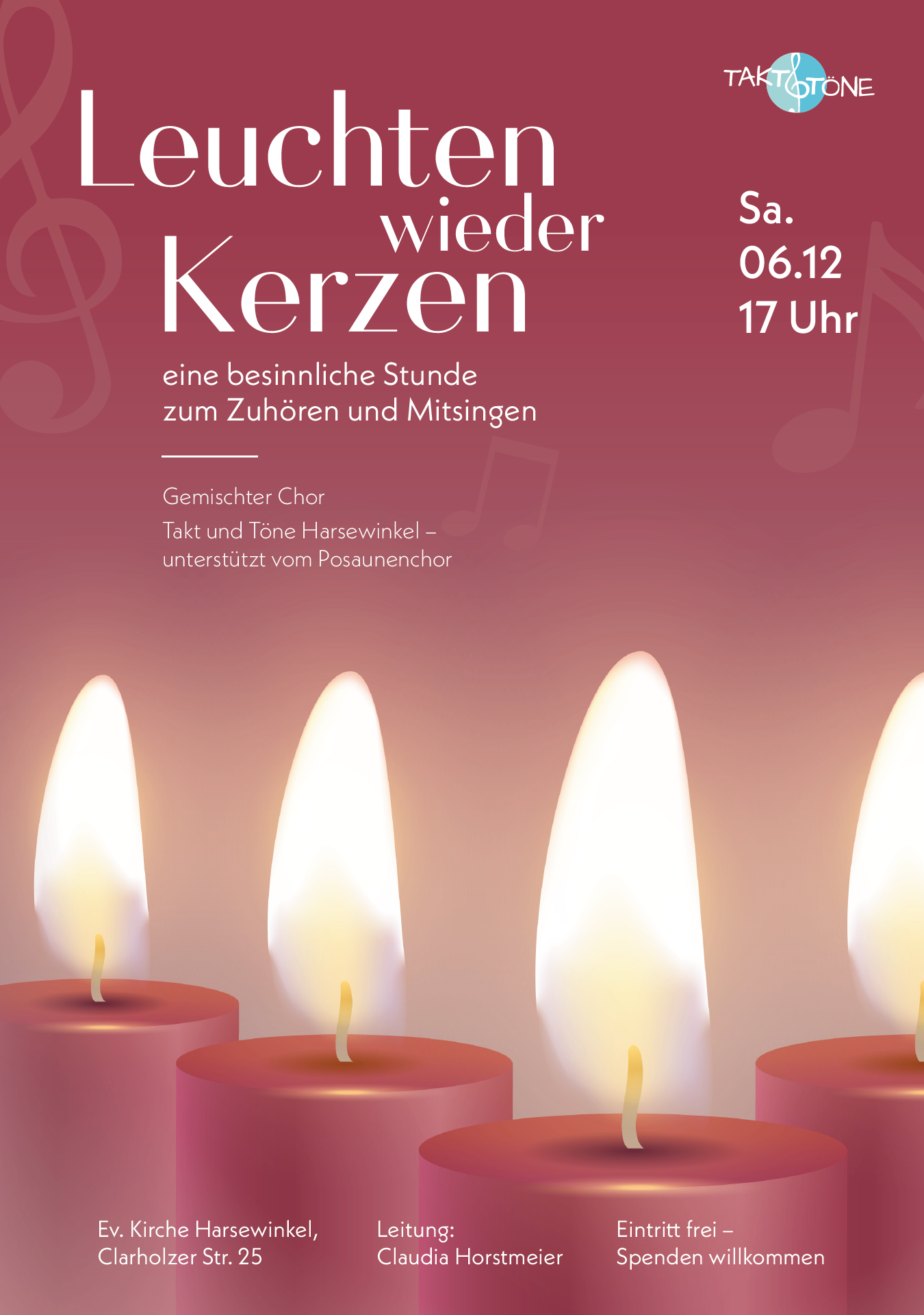 Am Samstag, den 6. Dezember, um 17 Uhr lädt der gemischte Chor „Takt und Töne“ Harsewinkel zu einer musikalischen „besinnlichen Stunde“ in die Evangelische Kirche Harsewinkel, Clarholzer Straße 25, ein.