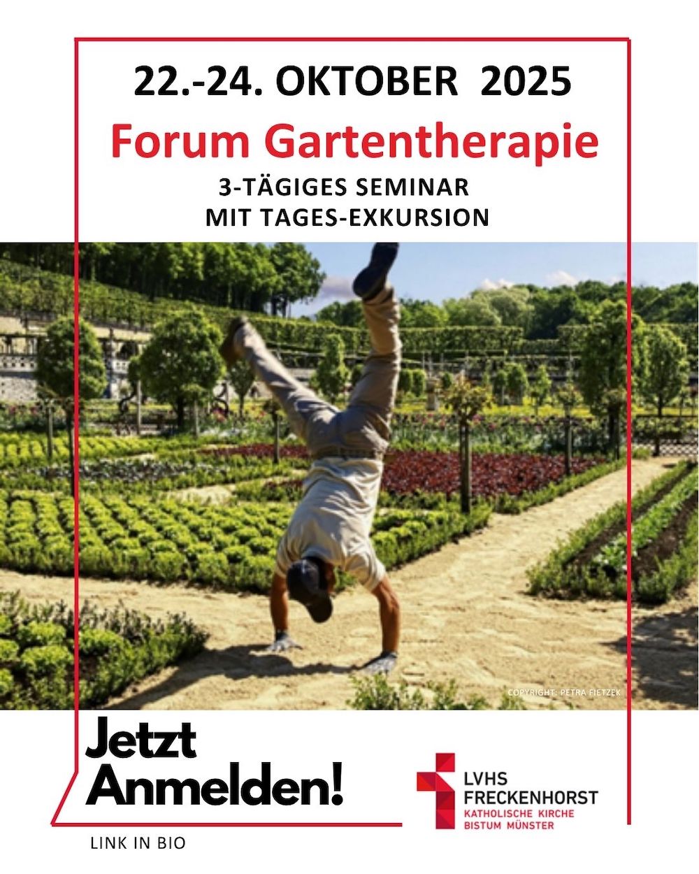 Der Aufenthalt in der Natur kann entspannen und heilen, das beweisen inzwischen viele Studien. Naturbegeisterte und Gartentherapeuten oder daran Interessierte sind zu einem dreitägigen Forum vom 22.-24.10.2025 in die Landvolkshochschule eingeladen. Dabei wird die bekannte WDR-Gartenexpertin Anja Klein Tipps zum Gärtnern im Hochbeet im Vortrag vermitteln. Der Wildkräuterexperte und Sachbuchautor Rudi Beiser wird einen Workshop zum Heilpflanzen abhalten, während der Gartentherapeut Martin Pfannekuch die Möglichkeiten der Gartentherapie im offenen Maßregelvollzug vorstellen wird. Die Tagesexkursion wird zum außerschulischen Lernort der Falken in Bielefeld, dem Halhof führen und zum „Knastladen“ der Justizvollzuganstalt in Bielfeld. Hier wird auf einem Hektar gartentherapeutisch gearbeitet.