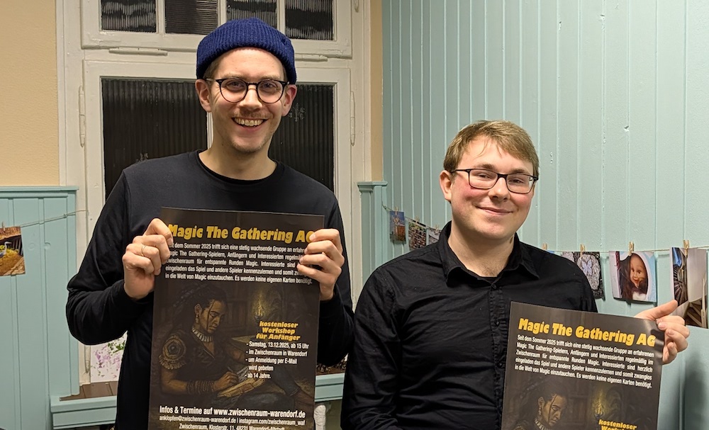 Im Zwischenraum an der Klosterstraße 11 trifft sich seit August diesen Jahres eine stetig wachsende Gruppe von Magic The Gathering Spielern. Die aktuell etwa dreißig Leute starke Spielrunde aus erfahrenen Spielern, Wiedereinsteigern und Anfängern aus dem gesamten Kreis Warendorf trifft sich zwei Mal pro Woche für gemeinsame Spieleabend des beliebten Sammelkartenspiels. “Das komplexeste Kartenspiel der Welt” titelte die SZ im November in einem großen Artikel über das Spiel. Dass der Einstieg gar nicht so komplex ist, möchte die Spielgruppe um Maciej Gronek und Felix Schneegans mit einem ersten kostenlosen Workshop am 13.12.2025 ab 15 Uhr im Zwischenraum beweisen. Im Workshop werden die Historie und die Grundregeln des Spiels erklärt, die wichtigsten Schlüsselfähigkeiten und Mechaniken erläutert und ein Überblick über die verschiedenen Spielformate gegeben. Im Anschluss wird in kleinen Gruppen mit vorhandenen deutschsprachigen Karten gespielt, denn so lernt man das Spiel am besten.