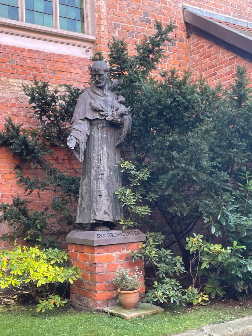 Statue des Heiligen Franziskus im Franziskanerkloster in Danzig, Garten im Kreuzgang des Franziskanerklosters in Danzig