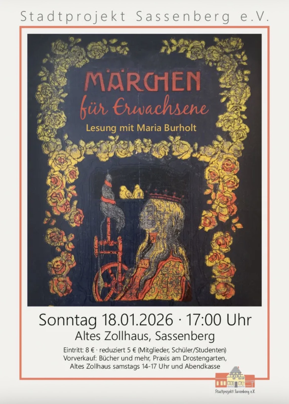 Zu einer besonderen literarischen Veranstaltung lädt der Stadtprojekt Sassenberg e.V. am Sonntag, 18. Januar 2026, ein. Unter dem Titel „Märchen für Erwachsene“ findet ab 17 Uhr eine Lesung mit Maria Burholt im Altes Zollhaus statt.