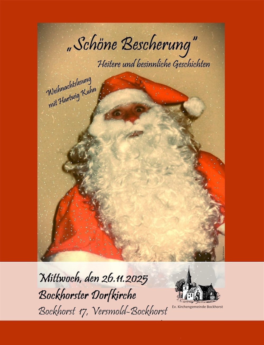 „Schöne Bescherung“ – Heitere und besinnliche Geschichten Hartwig Kuhn liest am Mittwoch, den 26. November selbstgeschriebene Weihnachts- und Familiengeschichten in der Bockhorster Dorfkirche. Mit seinen warmherzigen, nachdenklichen und witzigen Texten möchte der Versmolder Autor bei seiner weihnachtlichen Lesung die Zuhörenden verzaubern. Weihnachten ist geprägt durch Erinnerungen und Traditionen. Da wird die Suche nach dem passenden Baum zur Herausforderung, der kleine Paul bekommt leuchtende Augen und durch den Schnee stapft ein kleines Mädchen und erlebt ihren ersten Wintertag. Erleben Sie eine schöne Einstimmung auf die Festtage. Freuen Sie sich auf einen zauberhaften adventlichen Abend, mit Gedankenbildern und -texten, die alle Sinne anregen. Lassen auch Sie Weihnachten in ihr Herz. Einlass 19:00 Uhr, Beginn 19:30 Uhr, Bockhorst 17 Der Eintritt beträgt 12,- Euro. Davon gehen 2,- € als Spende an die Bockhorster Kirchengemeinde. Die Karten sind erhältlich im Vorverkauf: Atelier Stückwerk, Sperberstraße 3, Versmold, Tel.: 05423/41709 und 0175/5614378 oder Gemeindebüro Bockhorst, Öffnungszeiten: Mi und Fr von 9 – 12 Uhr, Tel. 05423/43679 Eine Kartenreservierung ist leider nicht möglich! Weitere Infos unter: www.kuhn-gedanken.de