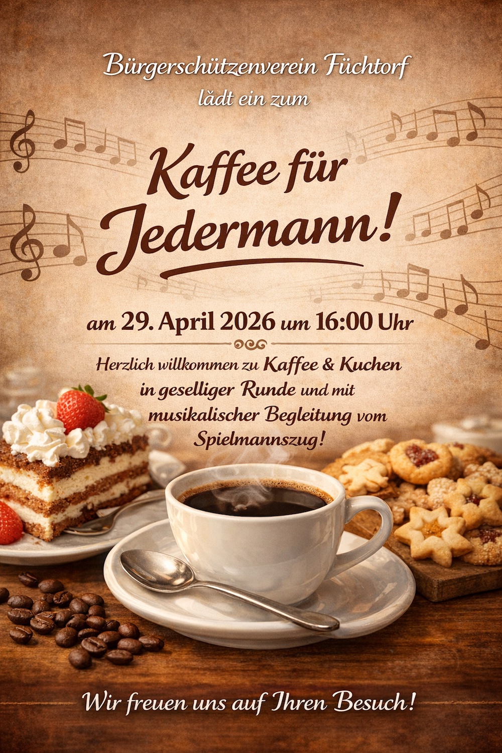Der BSV Füchtorf lädt alle Bürgerinnen und Bürger herzlich zu einem gemütlichen Beisammensein ein: Am Mittwoch, den 29. April 2026, findet ab 16:00 Uhr auf dem Schützenplatz in Füchtorf der diesjährige Seniorenkaffee – beziehungsweise Jedermann-Kaffee – statt.