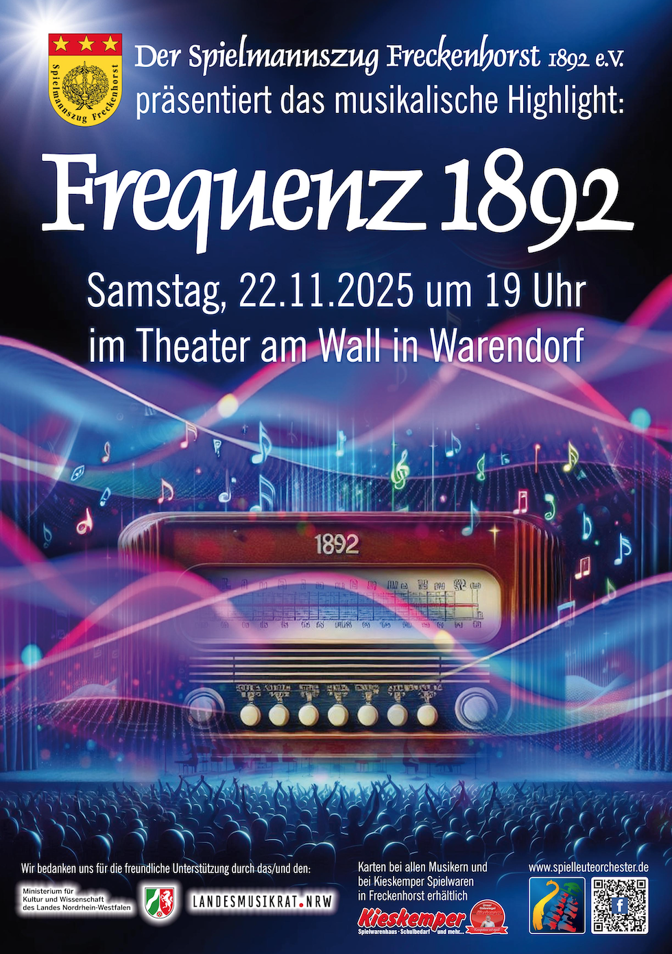 Der Spielmannszug Freckenhorst 1892 e. V. präsentiert das musikalische Highlight „Frequenz 1892“ am Samstag, 22. November 2025, um 19:00 Uhr im Theater am Wall in Warendorf. Karten sind bei allen Musikerinnen und Musikern sowie bei Kieskemper Spielwaren in Freckenhorst erhältlich. Weitere Informationen unter www.spielleuteorchester.de