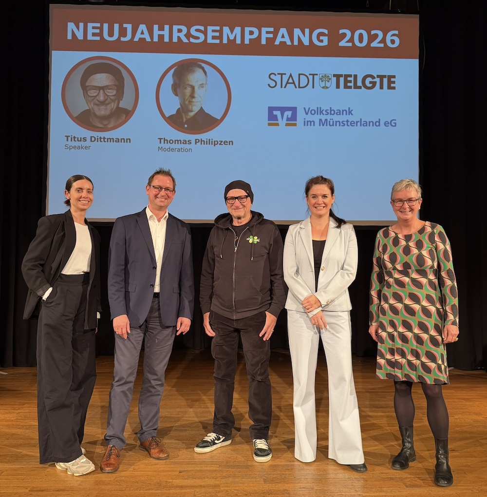 Foto (v.l.): Annika Becker (Kulturmanagement), Andreas Terborg (Volksbank im Münsterland), Festredner Titus Dittmann, die künftige Bürgermeisterin Katja Behrendt und Ulrike Brandt (Kulturbüro). ©Stadt Telgte