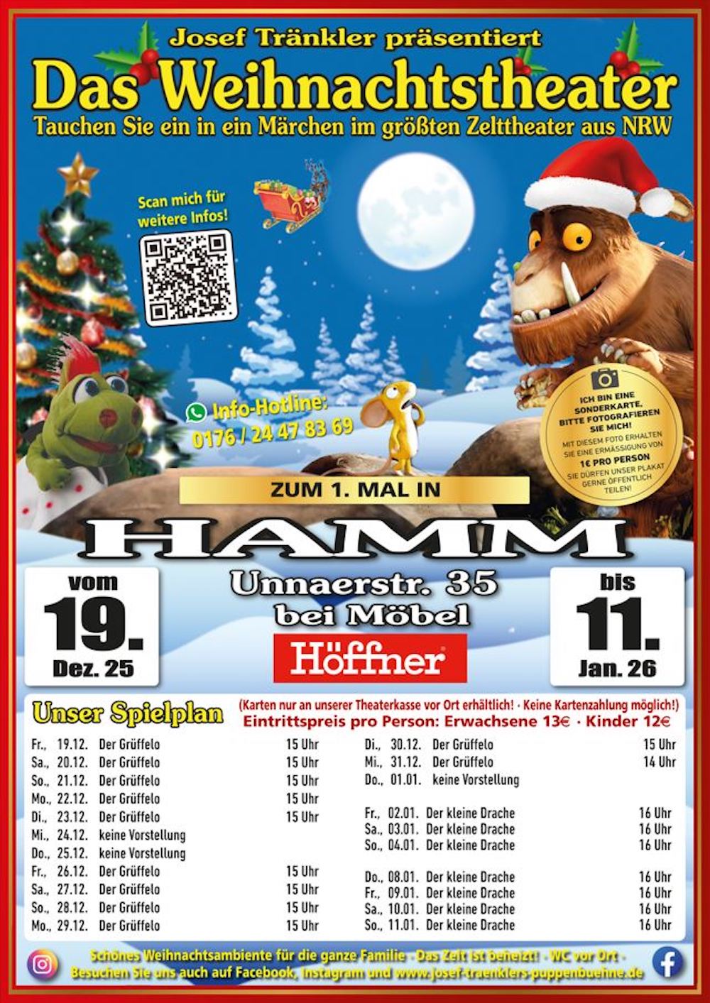 Mit einem stimmungsvollen Weihnachtsprogramm gastiert Josef Tränklers Puppenbühne in diesem Jahr vom 19. Dezember 2025 bis zum 11. Januar 2026 in Hamm. Das traditionsreiche Familienunternehmen tritt inzwischen mit zwei Bühnen parallel auf – die nächste Generation der Familie Tränkler ist in die Fußstapfen der Eltern getreten und führt mit viel Leidenschaft das Figurentheater fort.