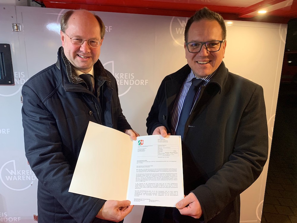 Landrat Dr. Olaf Gericke (l.) übergibt die Haushaltsverfügung an Everswinkels Bürgermeister Sebastian Seidel.