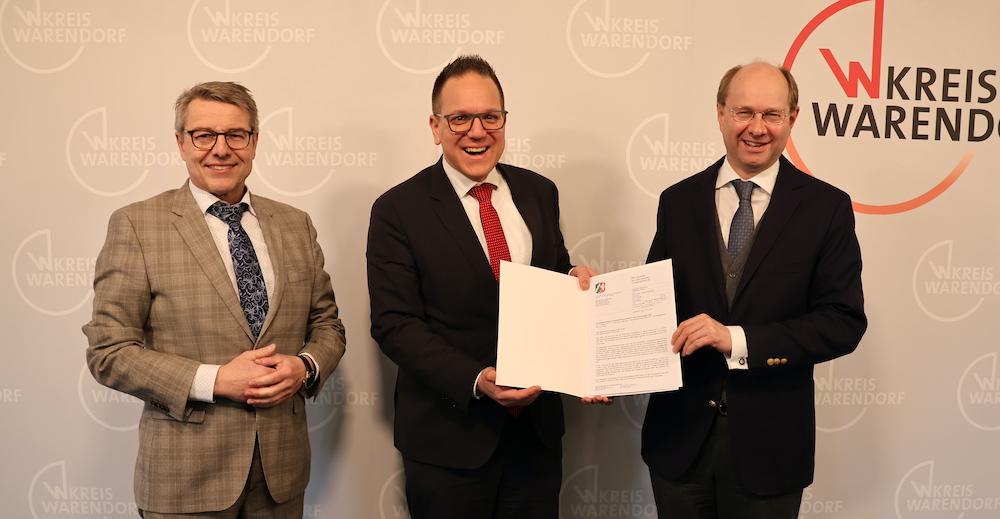 Landrat Dr. Olaf Gericke (r.) und Kreisdirektor Dr. Stefan Funke (l.) übergaben Bürgermeister Sebastian Seidel die Haushaltsverfügung für die Gemeinde Everswinkel.