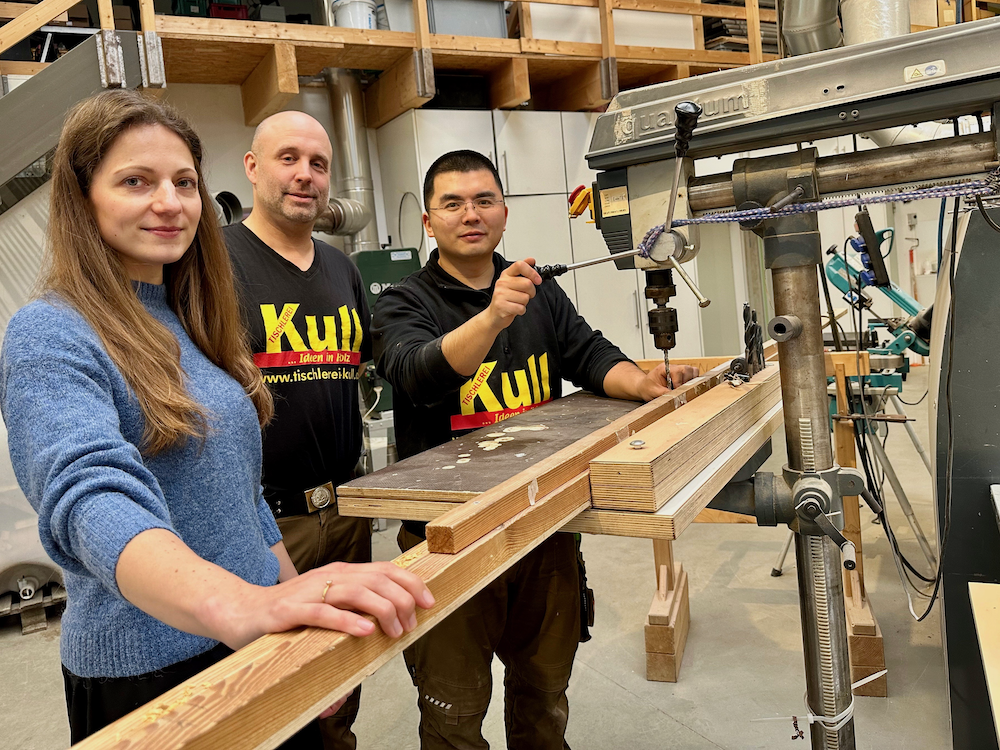 Die Sprachbarriere sei am Anfang die größte Hürde gewesen, berichtet Markus Kull. „Als er vor einem halben Jahr nach Deutschland kam, konnte er nur wenig Deutsch. Wir haben uns mithilfe eines digitalen Sprachübersetzers geholfen. Das machen wir noch heute, wenn es schwieriger wird.“ Inzwischen hat sich der 33-Jährige im achtköpfigen Team gut eingewöhnt und unterstützt seine Kolleginnen und Kollegen bei klassischen Tischlerarbeiten im Betrieb oder auf den Baustellen. „Wir haben ihn gleich mitgenommen auf die Baustellen. Ob der Einbau von Fenstern, Fußbodenlegen oder Möbelbau, ,Karl‘ ist immer dabei“, erzählt Markus Kull, der noch immer ganz beeindruckt von dem Mut des Familienvaters ist: „Chapeau, dass er den Schneid hatte, diesen Schritt zu gehen und alles hinter sich zu lassen. Das macht nicht jeder so einfach.“ Den neuen chinesischen Azubi hat Markus Kull, wie er sagt, „on top“ eingestellt. Jährlich startet ein Azubi bei Kull seine Ausbildung. Neben „Karl“ hat im vergangenen Herbst noch eine 18-jährige Frau die Ausbildung in der Tischlerei begonnen.