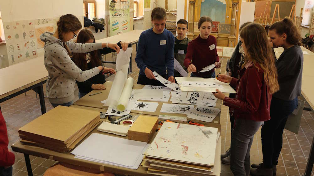 Das im 17. Jahrhundert zu einem Residenzschloss im Stil der Renaissance ausgebaute Wasserschloss Raesfeld bot den idealen Schauplatz für die Veranstaltung. Nach einer kurzen Führung über das Schlossgelände konnten die Schüler in der Tischlerwerkstatt des Schlosses verschiedene Experimente zum Fliegen und Flug durchführen, um danach die Techniken des alten Malens kennen zu lernen und auszuprobieren. Die Kontaktaufnahme zwischen den deutschen Schülern vom Laurentianum und den niederländischen Schülern des Bonhoeffer-College in Enschede erfolgte zunächst noch recht zögerlich, aber schon recht schnell wurde munter drauf los gequatscht in einer Mischung aus Deutsch, Englisch und Niederländisch.