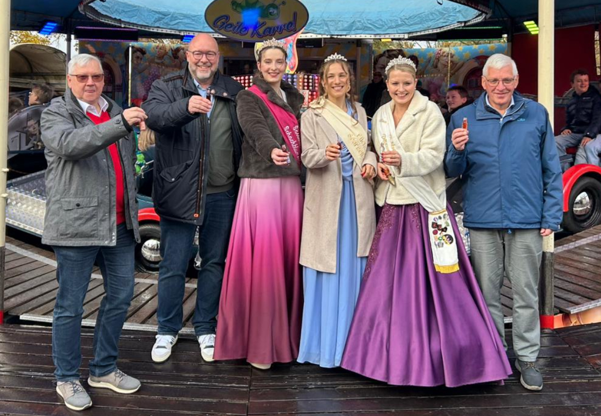 Gewerbevereinsvorsitzender Jörg Schöne gab gemeinsam mit Bürgermeister Josef Uphoff, dem stellvertretenden Bürgermeister Claudius Freiwald sowie den anwesenden Repräsentantinnen der umliegenden Orte den Startschuss für das beliebte Stadtfest. Unter ihnen waren auch Sassenbergs Schachblumenfee Lisa Pankewitsch, Füchtorfs Spargelkönigin Vivien Ruhe und Strombergs Pflaumenkönigin Nina Sunderkemper.