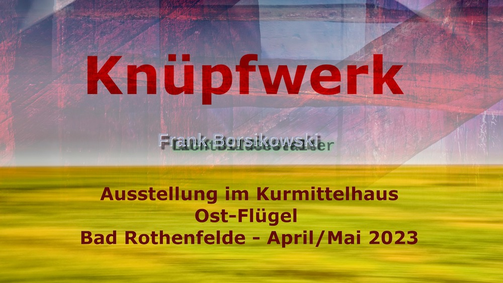 Damit wandelt sich Bad Rothenfelde einmal mehr vom Kurort in einen Ausstellungsort. Im Ostflügel des Kurmittelhauses (Eintritt frei) sind Werke, des in Bad Rothenfelde ansässigen, Fotokünstlers Frank Borsikowski zu sehen. Gezeigt werden Bilder aus den Serien Knüpfwerk und Schwebende Landschaften.