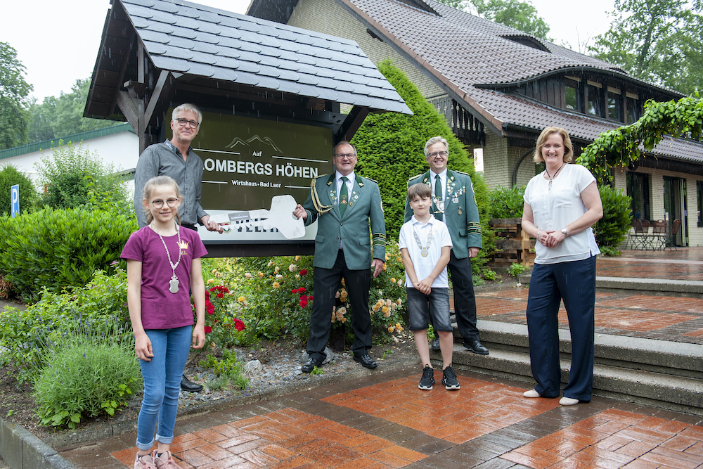 Freuen sich über den neuen Pächter von „Blombergs Höhen“ in Bad Laer: Königin Sonja I., König (und Vizepräsident) Holger I., Präsident Hermann Pues, Wirt Frank Otte, Kinderkönigin Lina I. und ihr Prinzregent Philipp I.