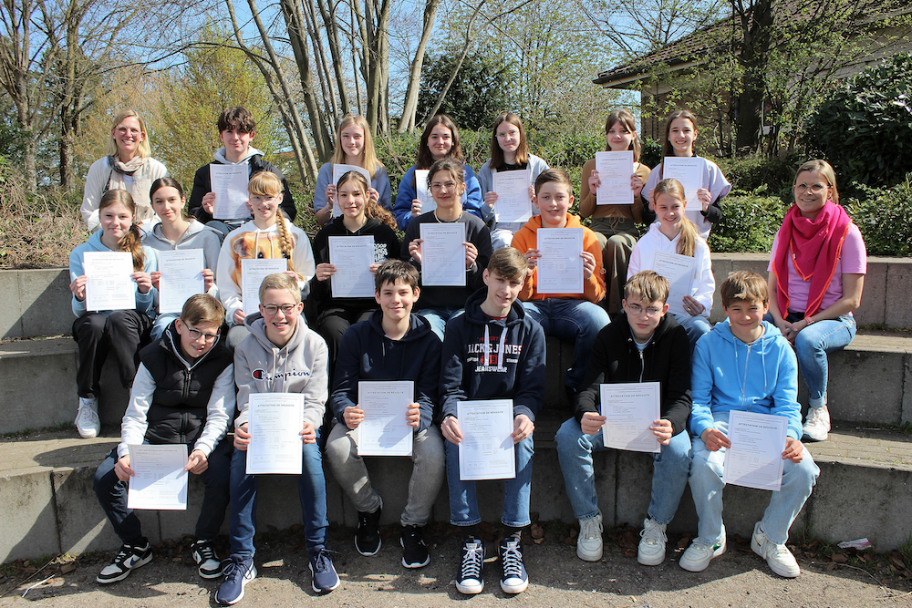 Insgesamt 20 Schülerinnen und Schüler des Mariengymnasiums haben in diesem Schuljahr das Zertifikat erhalten. Tim Maximilian Möllers aus der Jahrgangsstufe EF erreichte die Zertifikatsstufe B1. Drei Schülerinnen aus der neunten Klasse erhielten das Zertifikat der Stufe A2: Maja Aloric, Leni Keller, Tamara Zobel. Die jüngsten Teilnehmer, sechszehn Achtklässler, haben sich unter der Leitung von Französischlehrerin Julia Koch auf die Prüfung vorbereitet und das Niveau A1 bescheinigt bekommen. Das sind Maya Aerdker, Jannis Bartsch, Pauline Bergmann, Hanna Bury, Jorias Carrier, David Janke, Helen Janke, Mika Klassen, Pia Kösters, Marlene Oster, Lakysha Panasenko, Justus Rotermund, Linda Senger, Hannes Weitkamp, Viktoria Witt und Felix Wortmann. Die anderen Teilnehmer wurden bei der Vorbereitung von Französischlehrerin Christiane Bergmann-Hinkel betreut. Alle dürfen sich freuen, einen international anerkannten Nachweis ihrer französischen Sprachkenntnisse in den Händen zu halten.