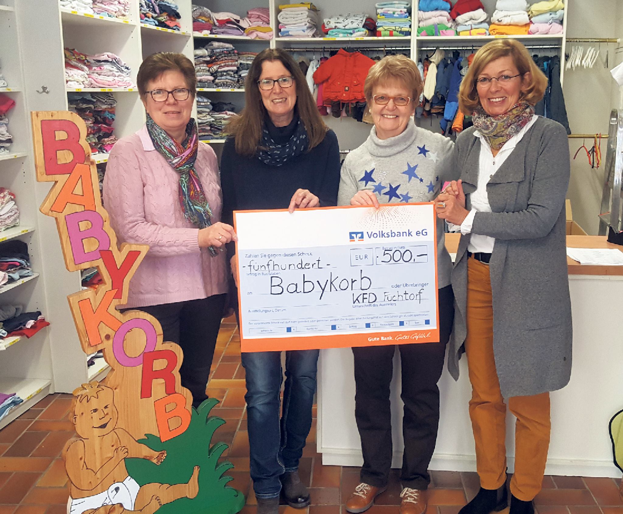 Warendorf/Füchtorf. Freude an der Kolpingstraße in Warendorf: Mit einer Spende von 500 Euro bedachten die Verantwortlichen der Bastelgruppe der Katholischen Frauengemeinschaft Deutschlands (KFD) aus Füchtorf die Damen des „Babykorbs“ in der Kreisstadt. Seit langem spenden die Frauen alljährlich nach ihrem traditionellen Weihnachtsbasar einen Teil des Erlöses an den „Babykorb“. Aus den Händen der Bastelgruppenmitglieder Mathilde Greiwe und Angela Meyer nahmen Barbara Elpers und Hildegard Wekeiser die Spende für den „Babykorb“ entgegen. Sie bedankten sich sehr für die Finanzspritze, die es dem „Babykorb“ ermögliche, einige Anschaffungen für das ehrenamtlich geführte Geschäft an der Kolpingstraße 7 zu tätigen. Kerngeschäft des „Babykorbs“ ist es, ausschließlich gespendete Gebrauchsgegenstände und Kleidungsstücke des täglichen Bedarfs für Säuglinge und Kleinkinder gegen geringes Entgelt weiterzugeben. Dieser Service steht uneingeschränkt allen Interessenten zur Verfügung. Die Gebrauchsgegenstände und Kleidungsstücke sollten allerdings in einem guten Zustand sein. Zurzeit könnten die Damen im „Babykorb“ gut Kinder- und Sportwagen, Buggys sowie Fahrrad- und Autositze gebrauchen. Die Öffnungszeiten sind dienstags von 15 bis 17 Uhr und donnerstags von 9 bis 11 und von 15 bis 17 Uhr. Interessenten, die Spenden abgeben wollen, können sich während der Öffnungszeiten im „Babykorb“ melden oder bei Barbara Elpers unter Telefon 60433.