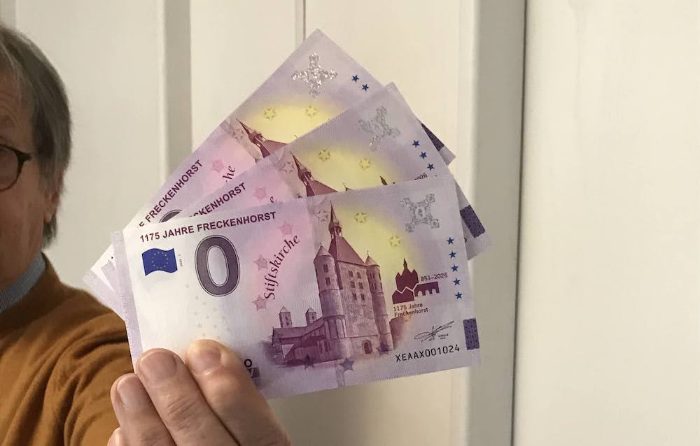 Die Vorbereitungen zum Jubiläumsjahr 2026 laufen auf Hochtouren. Wir vom Freckenhorster Heimatverein haben für das Jubiläumsjahr 1175 Freckenhorst einen eigenen Euroschein drucken lassen. Er fühlt sich echt an und erfüllt alle Sicherheitsmerkmale. Ganz wie ein normaler Euroschein. Leider ist er nichts wert. Trotzdem ist der 0-Euro-Schein ein Renner.