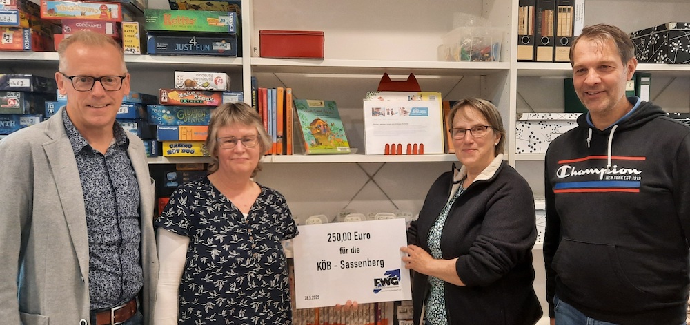 Die Freie Wählergemeinschaft (FWG) Sassenberg hat der Katholischen Öffentlichen Bücherei (KÖB) der Kirchengemeinde St. Johannes und Marien eine Spende in Höhe von 250 Euro überreicht. Übergeben wurde die Summe von den FWG-Mitgliedern Jens Büdenbender und Christian König an die Leiterin der KÖB Hiltraud Bergmann und Waltraud Gode, die die Bücherei gemeinsam mit 19 weiteren Ehrenamtler betreuen.