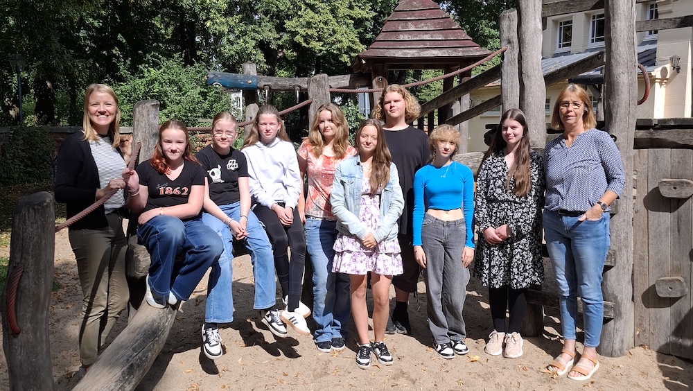 In den Sommerferien fand im Haus der Familie Warendorf ein viertägiger Babysittingkurs statt, an dem neun junge Menschen teilnahmen. Unter fachkundiger Anleitung, durch Sabine Erfmann (ganz rechts) und Annika Wester (ganz links), erhielten sie eine umfassende Ausbildung, die sie auf ihre zukünftigen Aufgaben als Babysitter*innen vorbereitet. Der Kurs bot eine breite Palette an praxisnahen Inhalten. So lernten die Jugendlichen zunächst die Grundlagen der Säuglings- und Kleinkindpflege kennen – vom Wickeln hin zu Schlafgewohnheiten und dem sicheren Umgang mit den Kleinsten. Darüber hinaus standen altersgerechte Spielideen und kreative Beschäftigungsmöglichkeiten für Kinder von null bis zehn Jahren auf dem Programm. Ergänzend erhielten die Teilnehmenden Einblicke in die wichtigsten Entwicklungsphasen von Kindern und erfuhren, wie sich körperliche, emotionale und soziale Fähigkeiten je nach Alter unterscheiden. Zum Programm gehörte außerdem ein Einblick in die Erste Hilfe am Kind. Die Teilnehmenden erfuhren, wie bei kleinen Unfällen, Insektenstichen oder Notfällen angemessen gehandelt werden kann. Den Abschluss bildete schließlich eine Einführung in die rechtlichen Grundlagen des Babysittens, die Themen wie Aufsichtspflicht, Versicherung und verbindliche Regeln behandelte. Am Ende erhielten alle Teilnehmenden ein Zertifikat, das ihre neu erworbenen Kenntnisse und Fertigkeiten bescheinigt.