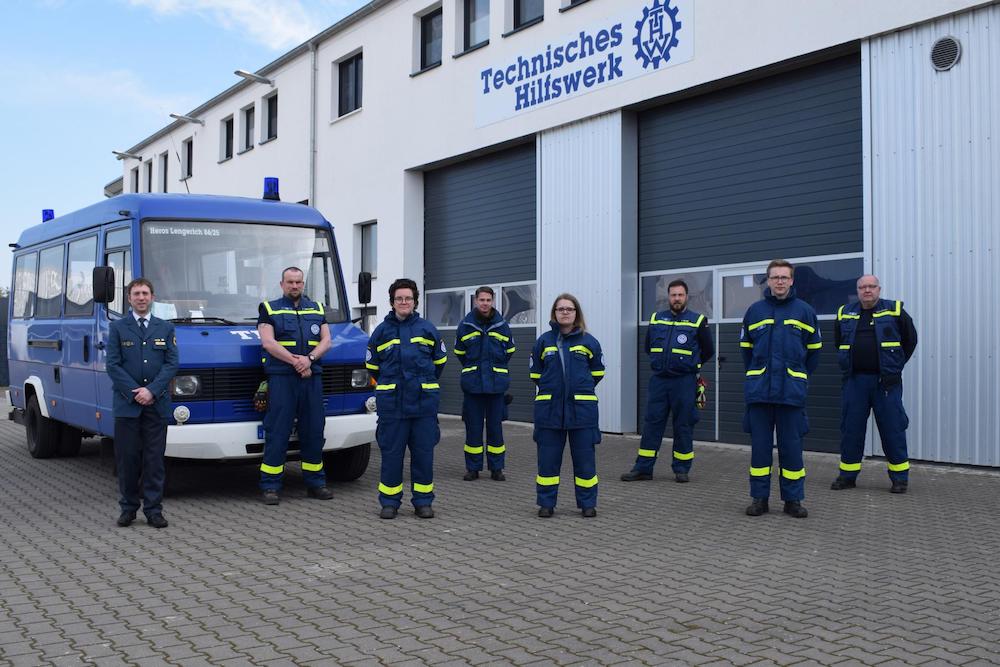 v. l. n. r.: Ortsbeauftragter Mario Raab, neue Einsatzfahrer Tobias Wollheim, Tatjana Buddenkotte, Jens Holtgers und Sabrina Krieglstein, Hospitant Alain Blind, neue Einsatzfahrer Jonas Dargel, Ausbilder Frank Petrich (THW Lengerich)