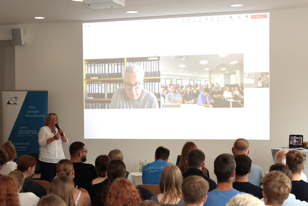 In seiner Anmoderation hob Roland Niehues hervor, dass der Fokus der Veranstaltungen auf der Gegenwart liege. Erkenntnisse aus der Vergangenheit könnten Schülerinnen und Schülern jedoch dabei helfen, Bezüge zu aktuellen Krisen und Herausforderungen herzustellen und eigene Standpunkte zu entwickeln. „Am Paul-Spiegel-Berufskolleg wollen wir die Kultur pflegen, sich aus der eigenen Meinungs-Bubble herauszubewegen, um zu vermeiden, dass wir in Parallelgesellschaften aneinander vorbeigehen“, so Niehues.
