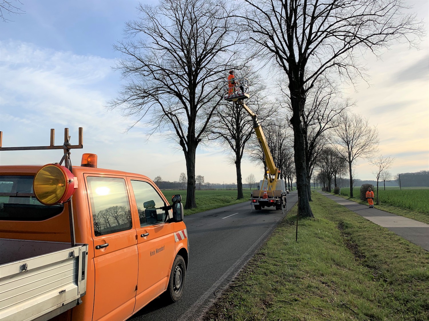Um die Sicherheit auf allen Kreisstraßen zu gewährleisten, haben die Mitarbeiter des Bauhofes in den vergangenen Wochen die Bäume an den Kreisstraßen kontrolliert. Abgestorbene oder morsche Äste – sogenanntes Totholz – sägten die Mitarbeiter ab, damit es nicht beim nächsten stärkeren Unwetter auf vorbeifahrende Autos fallen kann. Außerdem kontrollierten die Mitarbeiter, ob zwischen Fahrbahn und Baumkrone genügend Platz für Fahrzeuge mit hohen Aufbauten wie z.B. LKW vorhanden ist, damit diese ohne Probleme durch die Alleen fahren können.