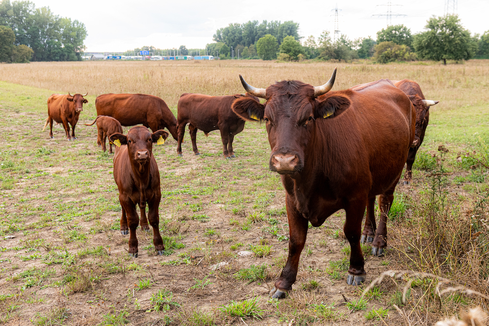 Auf einer 21-Hektar-Fläche zwischen Herne und Castrop-Rauxel weiden neuerdings besondere Rinder. Das „Rote Höhenvieh“ grast auf einer naturbelassenen Weide mit Sträuchern und findet Schutz vor Regen und Sonne im Wäldchen. Dort können sich nicht nur die Kühe frei bewegen. Rund 20 verschiedene Vogelarten sind dort zu Hause genauso wie Igel oder Rehe. Zugefüttert werden die Rinder nicht, deshalb ist diese Form der Rinderhaltung besonders umwelt- und klimafreundlich.