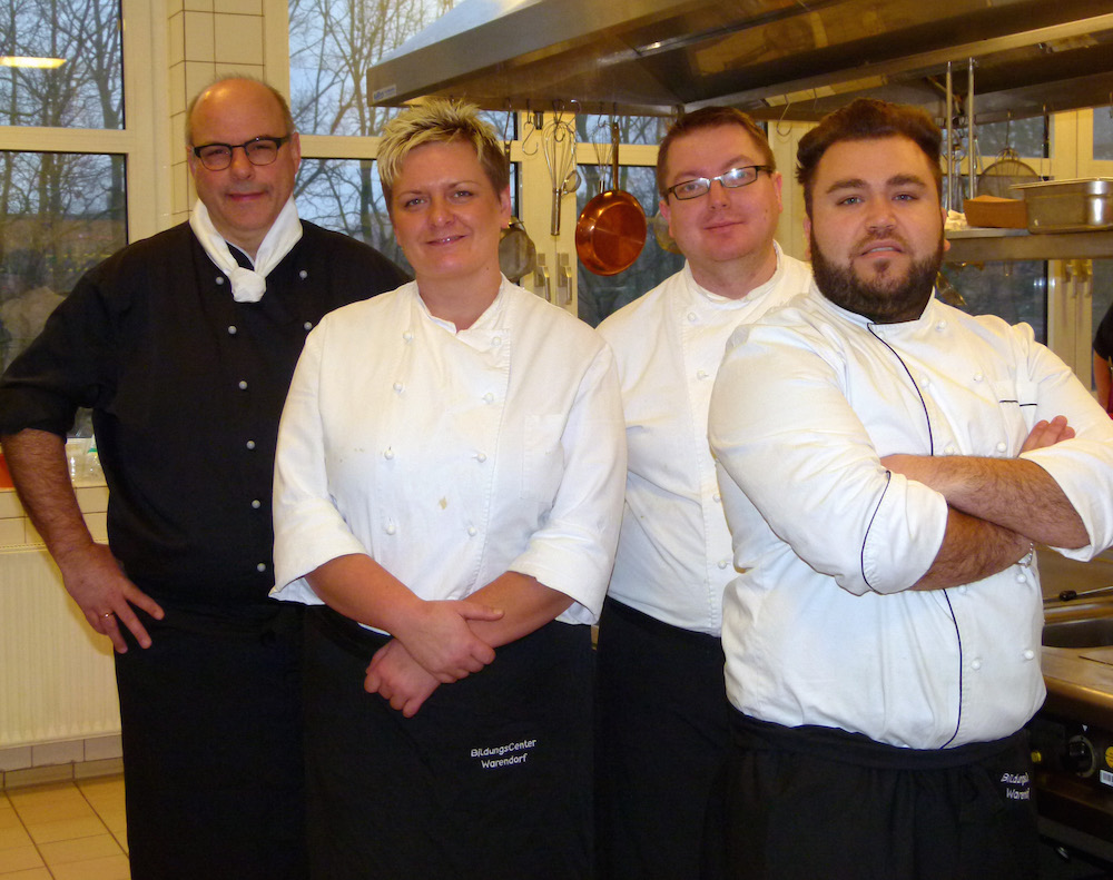 Küchenmeister Daniel Stallmeier mit seinen erfolgreichen Umschülern Justyna Kotlenga, Juri Richter und Enes Topyani (v. l. n. r.)