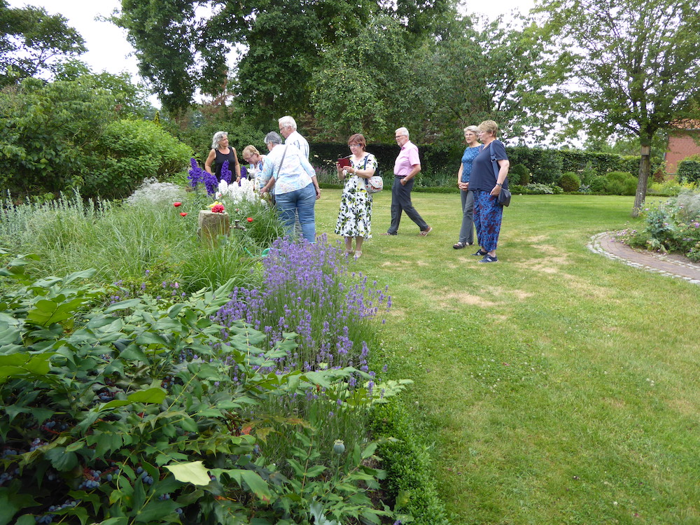 Zu einer Gartengenusstour starteten Mitglieder der Kolpingsfamilie Warendorf. Vier Gärten sollten an dem Nachmittag besucht werden. Heiner Schoppmann hatte die Idee und so konnten Gärten im Stadtgebiet und auf dem Lande angefahren werden. Nette Schmuckstücke gab es dabei zu sehen, aber auch im Detail schöne kunstvolle Gegenstände bereicherten das Gesamtbild. Gemütliche Ruheecken mit einem Dach von dicht gewachsenem Astwerk und grünen Blättern lud so zum verweilen ein. Oder ein kleiner Park mit gepflegter Rasenfläche, umsäumt von verschiedenem Baumbestand. Auch hier lud zwischendurch eine passend platzierte Sitzbank oder eine kleine Sitzgruppe zum Verweilen ein. Auch gab es eine gepflegte Rasenfläche zu sehen, diese war umsäumt mit bunten Blumen, dazwischen war eine nette kleine Vogeltränke platziert. Dann gab es aber auch noch den kleinen Gemüsegarten zu sehen. Zu ernten gibt es hier verschiedene Sorten wie Bohnen, Erbsen Salat oder Tomaten. Auch ein Gewächshaus bei der Aufzucht verschiedener Sorten. So konnte von den Teilnehmern viel bestaunt werden, oder auch Anregungen mit nach Hause genommen werden.