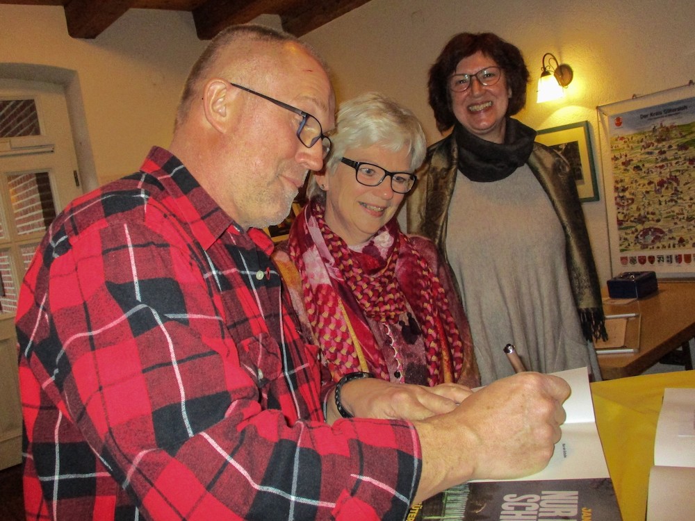 Jan Bobe (l.) bei der Signatur eines seiner Bücher für Heike Fritsche. Im Hintergrund die Organisatorin und Ortsvorsteherin Annette Niemeyer.