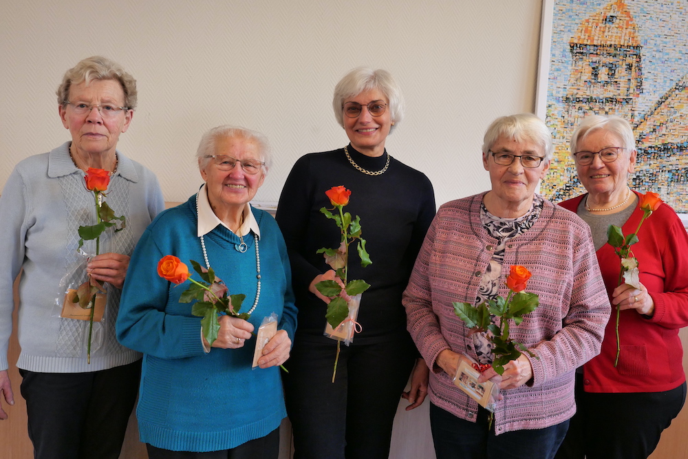 Doris Herbermann (Mitte) wurde für ihre Fleißarbeit am PC geehrt. Von den 13 ausscheidenden Bezirkshelferinnen waren nur Maria Beckmann, Ida Beckmann, Hedwig Sternberg und Gertrud Bröskamp (v.li.) anwesend.