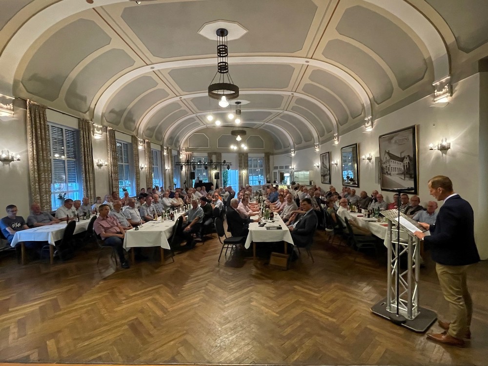 Trotz sonnigen Feierabendwetters waren die Mitglieder und Gäste der Raiffeisen Warendorf eG zahlreich im Saal Bütfering in Hoetmar erschienen. Nach der Begrüßung durch den Aufsichtsratsvorsitzenden Dr. Gregor Schulze Willbrenning durften sich die Landwirte erst einmal stärken. Im Anschluss folgte der Bericht des Vorstandes in dem der Vorstandsvorsitzende Heinz-Theo Stauvermann insbesondere auf die politischen Rahmenbedingungen einging, mit denen die Landwirtschaft zu kämpfen hat. „Es muss aufhören mit der ideologischen Verteufelung der Tierhaltung… Wenn wir nicht mehr genügend Lebensmittel produzieren, begeben wir uns in Abhängigkeiten und was daraus wird, haben wir bei der Energie gesehen.“ machte er auf die Missstände der fehlgeleiteten Agrarpolitik aufmerksam. Anschließend stellte der Geschäftsführer Reinhold Schmidt den Jahresabschluss für das Geschäftsjahr 2022 vor. Die Raiffeisen Warendorf kann erneut auf ein erfolgreiches Geschäftsjahr zurückblicken uns sieht sich gut gerüstet für die Herausforderungen der Zukunft. Mit dem durchweg positiven Ergebnis der Prüfung durch den Genossenschaftsverband konnten die Mitglieder ihren einstimmigen Beschluss schnell fassen. Auch über die Gewinnverwendung waren sich die Anwesenden schnell einig. Es wird eine Warenrückvergütung von 0,5 % und eine Dividende von 3 % an die Mitglieder ausgeschüttet. Die Entlastung von Vorstand und Aufsichtsrat erfolgte ebenfalls einstimmig. Einigkeit bestand auch bei den turnusmäßigen Wahlen zum Aufsichtsrat, in den D. Hunkemöller, H.-J. Take, M. Overhues und M. Heimann wiedergewählt wurden. Die anstehende Satzungsänderung wurde vom Geschäftsführer erläutert und schlüssig begründet, so dass es auch hier keinen Diskussionsbedarf gab. Nachdem Christian Borgmann (Geschäftsführer der Tochtergesellschaft Raiffeisen IMMO GmbH) unter Punkt Verschiedenes einen kurzweiligen Film über den Fortschritt der Wohnimmobilie an der Telgter Str. in Sendenhorst kommentiert hatte und das Konzept des „Servicewohnens“ erläuterte, ließen die Mitglieder den Abend gemütlich ausklingen.