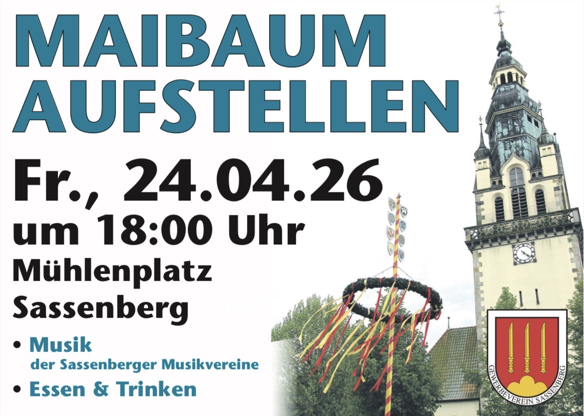Der Gewerbeverein Sassenberg lädt auch in diesem Jahr wieder zum traditionellen Maibaumaufstellen ein. Die Veranstaltung findet am Freitag, den 24. April, um 18:00 Uhr auf dem Mühlenplatz in Sassenberg statt und verspricht ein geselliges Beisammensein für Jung und Alt. Für die musikalische Unterhaltung ist bestens gesorgt: Verschiedene Sassenberger Musikgruppen werden den Abend begleiten, darunter der Fanfarenzug Sassenberger Landsknechte, der Spielmannszug Sassenberg sowie die Oldies. Mit ihrem abwechslungsreichen Programm schaffen sie die passende Atmosphäre für das traditionelle Ereignis. Auch für das leibliche Wohl ist gesorgt. Der Gewerbeverein bietet Speisen und Getränke zu Selbstkostenpreisen an, sodass Besucherinnen und Besucher den Abend in entspannter Runde genießen können. Der Gewerbeverein Sassenberg freut sich darauf, zahlreiche Gäste begrüßen zu dürfen. Eingeladen sind nicht nur alle Sassenbergerinnen und Sassenberger, sondern auch Besucher aus nah und fern, die gemeinsam das traditionelle Brauchtum feiern möchten.