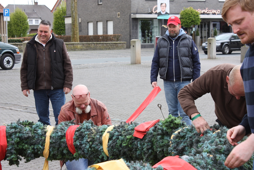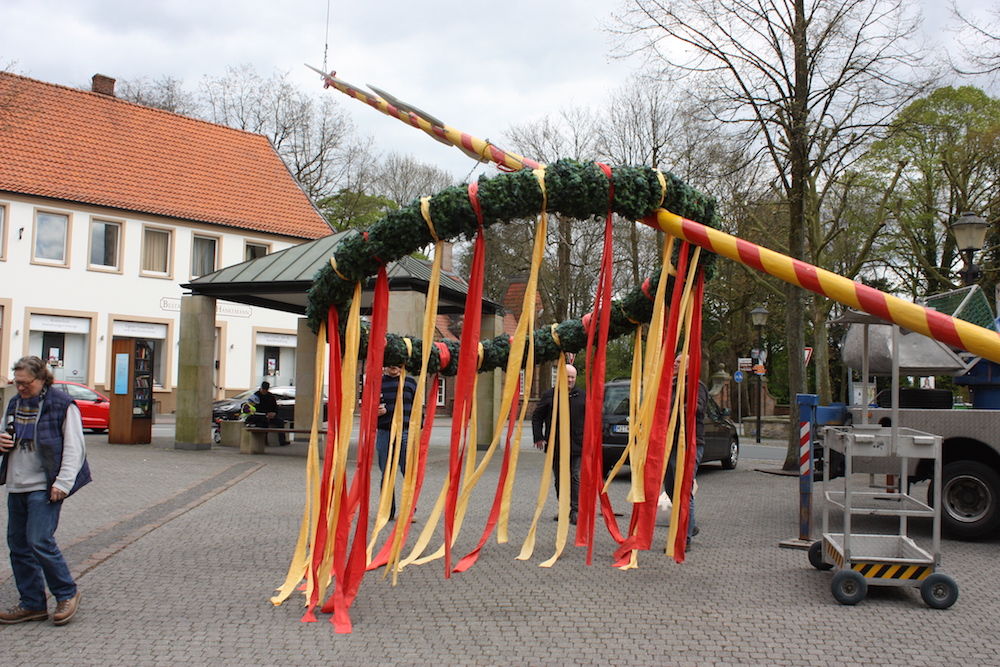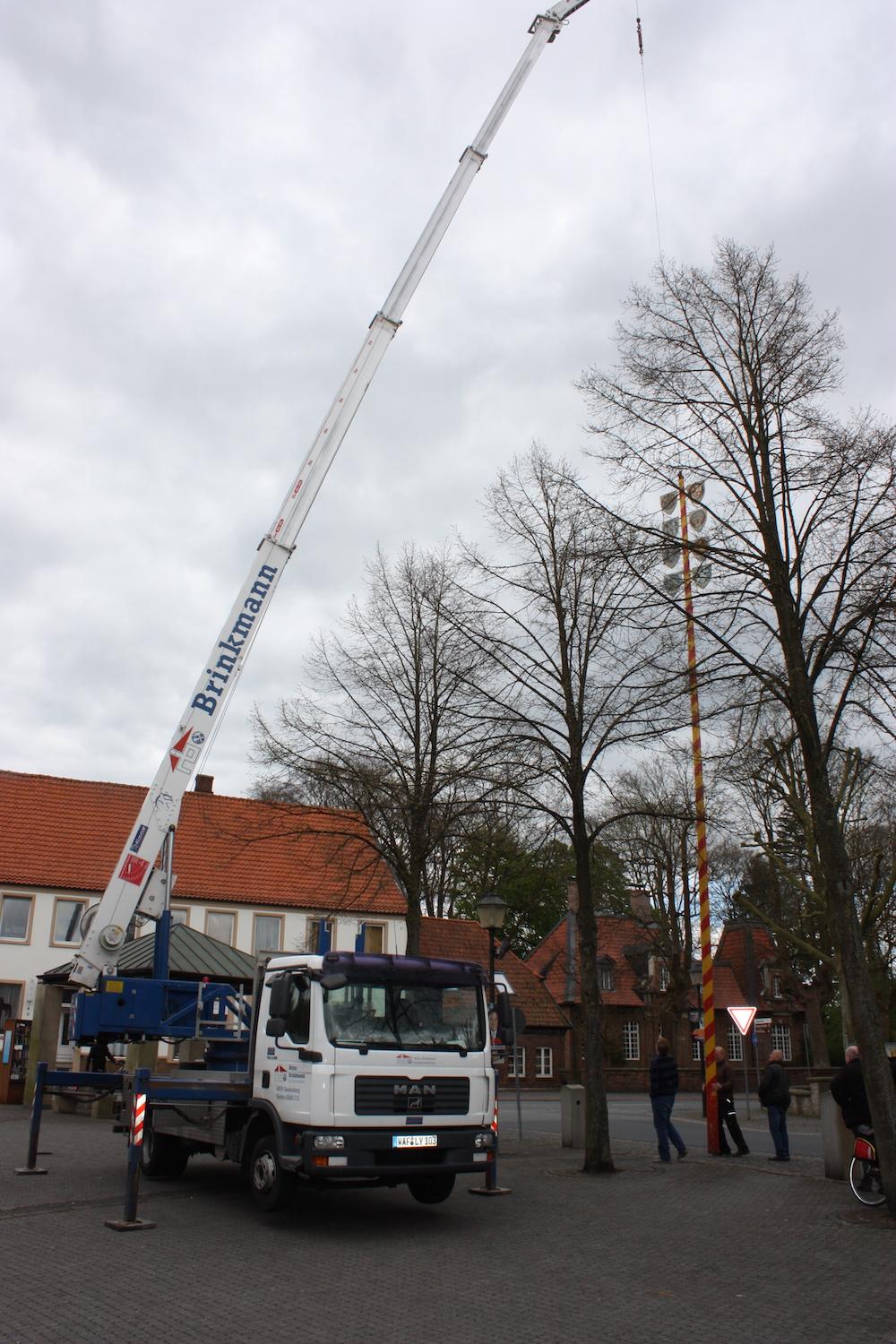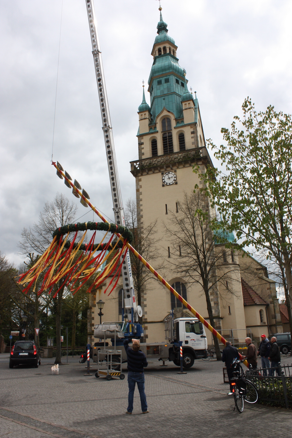 Die Mitglieder des Gewerbevereins Sassenberg und die freiwilligen Helfer haben am Samstag, den 29. April, den Maibaum mit Unterstützung des Krans der Dachdecker-Firma Heinz Brinkmann auf dem Mühlenplatz in Sassenberg aufgestellt, um den Wonnemonat Mai willkommen zu heißen.