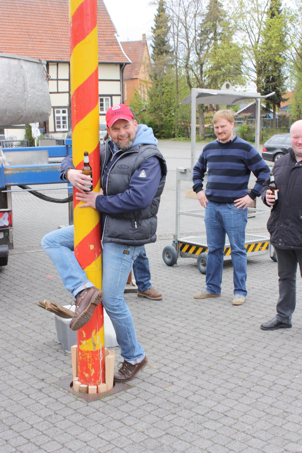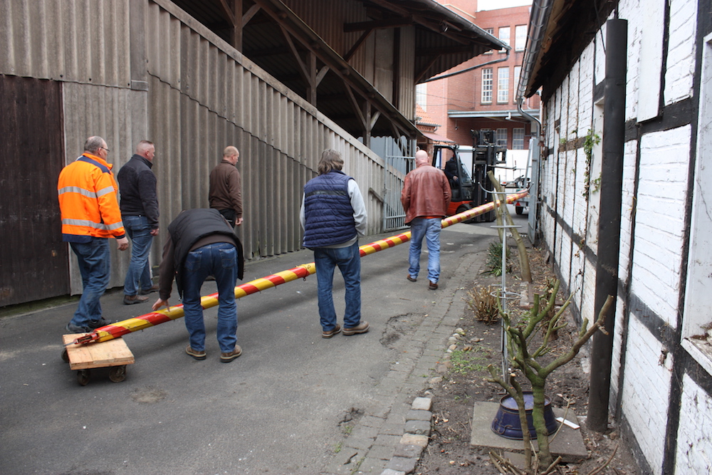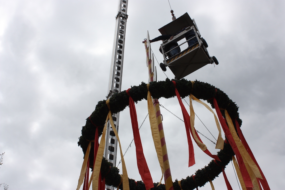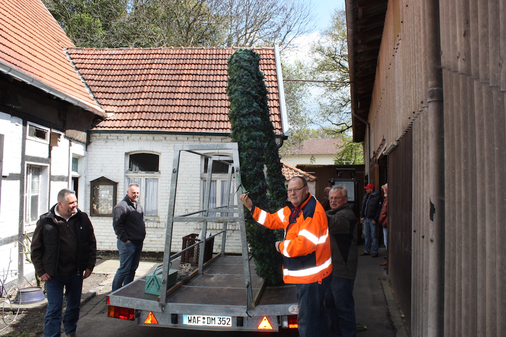 Die Mitglieder des Gewerbevereins Sassenberg und die freiwilligen Helfer haben am Samstag, den 29. April, den Maibaum mit Unterstützung des Krans der Dachdecker-Firma Heinz Brinkmann auf dem Mühlenplatz in Sassenberg aufgestellt, um den Wonnemonat Mai willkommen zu heißen.