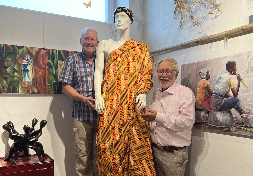 Als Eckard Geisler (l) zum Abschied seiner offiziellen Aufgaben in Ghana zum Chief „ehrenhalber“ ernannt wurde, erhielt er Gewand, Krone, Schuhe und das Zeptermesser als Zeichen seiner neuen Würde. Diese Gegenstände sind in der Ausstellung ebenfalls zu sehen.