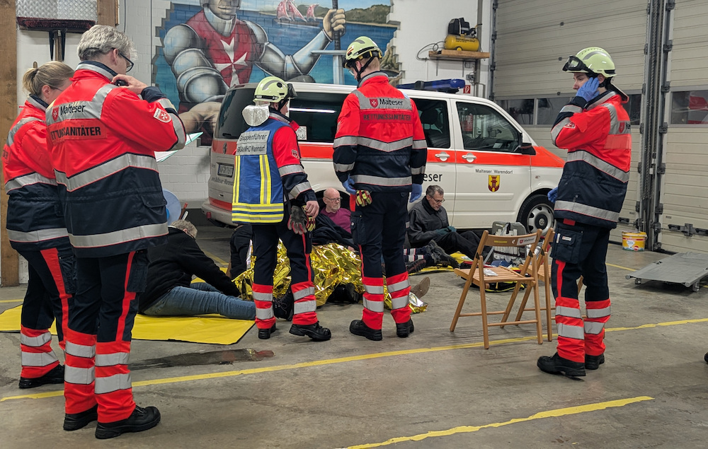 Bernd Köster, Verbandführer der Warendorfer Malteser, der die Übung organisiert hatte, und Viktoria Austermann, Gruppenführerin, beobachteten das Geschehen. Liam Craggs übernahm als Gruppenführer das Kommando über die Einsatzkräfte. Die erste Herausforderung bestand in der sogenannten Vorsichtung: Die schnelle Einschätzung der sechs Verletzten und deren Einteilung nach Schweregraden. Dabei wird nach einem Farbschema vorgegangen: „Grün“ steht für leicht verletzte Personen, „Gelb“ für schwere und „Rot“ für lebensbedrohliche Verletzungen.
