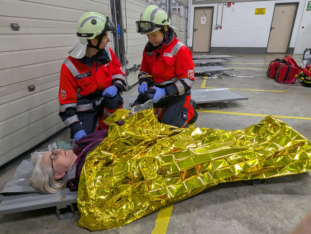 Simon Köster und Ava Linning (Rettungshelferin) betreuen eine Patientin (Mechthild Gersmann) mit Kreislaufproblemen