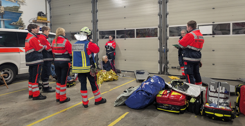 Am vergangenen Montag verwandelte sich die Straße vor der Fahrzeughalle der Warendorfer Malteser in einen Unfallort. Gegen 19.30 Uhr wurden sechs Helferinnen und Helfer der Besatzung des Gerätewagen Sanität (GW-San) alarmiert. Das Übungsszenario: Ein Glatteisunfall mit einigen kollidierten Fahrzeugen auf der A64 und mehreren Verletzten. Einige Patienten hatten sich spontan in eine nahegelegene Fahrzeughalle geflüchtet und dort eine Patientenansammlung gebildet.