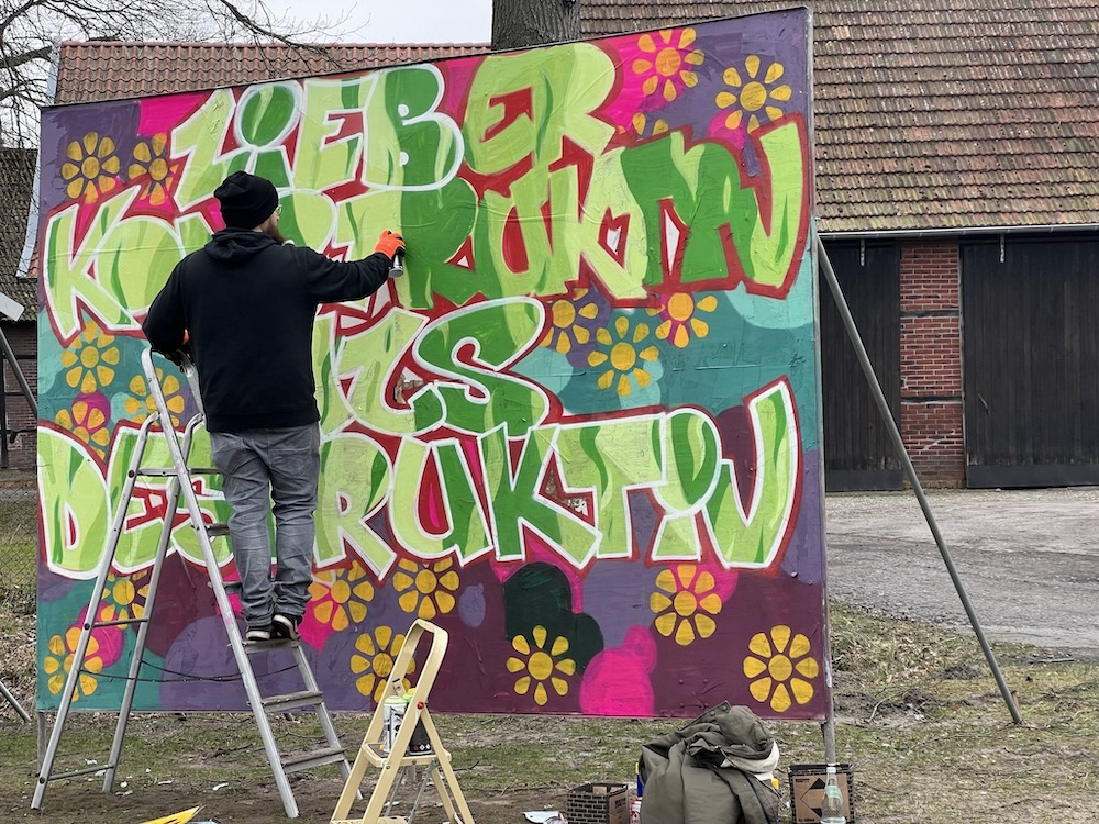 Der Sprayer wird auch für den Grünen Ortsverband Ostbevern aktiv, um dort eine Großfläche zu verschönern.