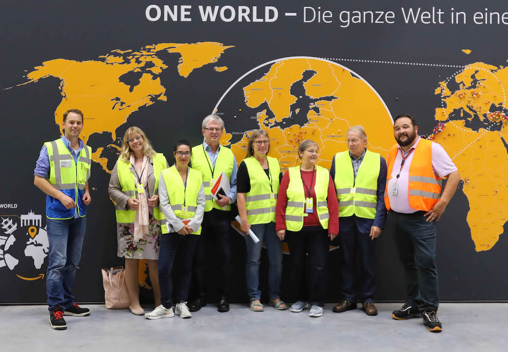 „Fluch oder Segen? Begrüßen wir die scheinbar unaufhaltsame Expansion des Online-Handelskonzerns auch im Kreis Warendorf?“ Um mehr Klarheit in dieser Frage zu gewinnen, besuchte die Fraktion von Bündnis 90/Die Grünen im Kreis Warendorf das Amazon – Logistikzentrum in Werne, steht doch die Errichtung einer weiteren riesigen Niederlassung im interkommunalen Gewerbegebiet „Marburg“ zwischen Oelde und Rheda-Wiedenbrück ins Haus. Einer der fünf Niederlassungsleiter und der stellvertretende Betriebsratsvorsitzende erläuterten der Fraktion die Betriebsabläufe. Die Angestellten, ein Drittel von ihnen Frauen, arbeiten im Dreischichtbetrieb. „Hier bekommen auch gering qualifizierte Kräfte aus 60 Nationen die Chance, nach einer Anlernzeit von zwei Wochen am ersten Arbeitsmarkt teilzuhaben“, wies Fraktionssprecherin Valeska Grap auf die Bedeutung des Unternehmens für Arbeitnehmer*innen hin. Kreistagsmitglied Bernhard Drestomark zeigte sich skeptisch: „Auch wenn Zulagen, z.B. zur Berufsunfähigkeitsversicherung gezahlt werden und Mitarbeiter*innen Aktien erwerben konnten, stellt sich die Frage, ob ein Monatslohn, der zu Beginn einen Euro unter den tariflichen Vereinbarungen liegt, genügt, um eine Familie ernähren und für das Alter vorsorgen zu können.“