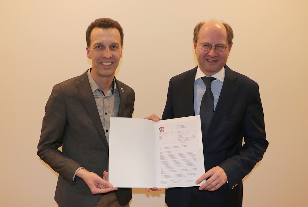 Der Haushaltsplan der Gemeinde Beelen hat grünes Licht erhalten. Landrat Dr. Olaf Gericke überreichte die Verfügung jetzt an Bürgermeister Rolf Mestekemper. Die Gemeinde kann ihren Haushalt für das laufende Jahr ab sofort bewirtschaften und die geplanten Maßnahmen umsetzen.