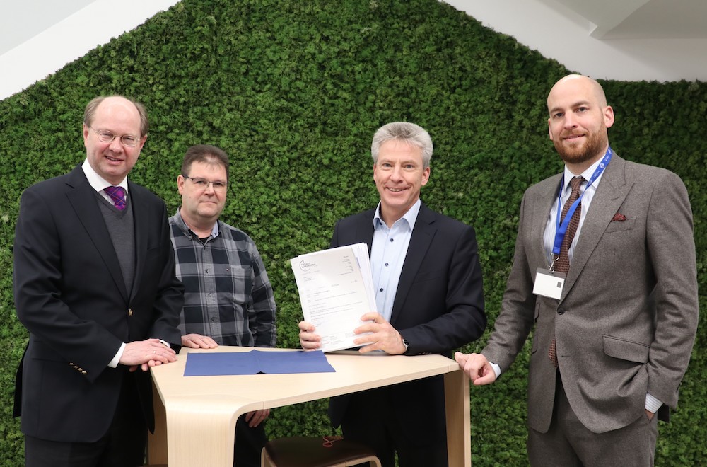 Landrat Dr. Olaf Gericke, Prokurist Marco Scharmann, Vorstandsvorsitzender Andreas Hartleif und Baudezernent Michael Ottmann (v.l.) freuen sich, dass die Baumaßnahme an der Dieselstraße in Sendenhorst im Frühling beginnen kann.