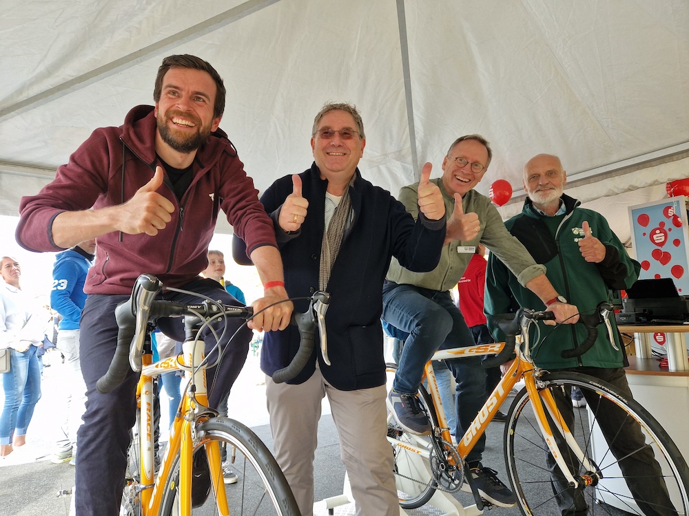Die Sparkasse belohnte den Einsatz der Verkehrswachten auf dem Veranstaltungsgelände direkt nebenan über das sogenannte Spendenradeln. Dort konnten die zahlreichen Besucher auf zwei aufgebauten Rennrädern ihr sportliches Können beweisen. Für jeden Meter der zurückgelegten Fahrstrecke spendete die Sparkasse den beiden Verkehrswachten einen Cent. Hinzugerechnet wurden noch die Kilometer der Sparkassen-Starter beim 65-km-Rennen.