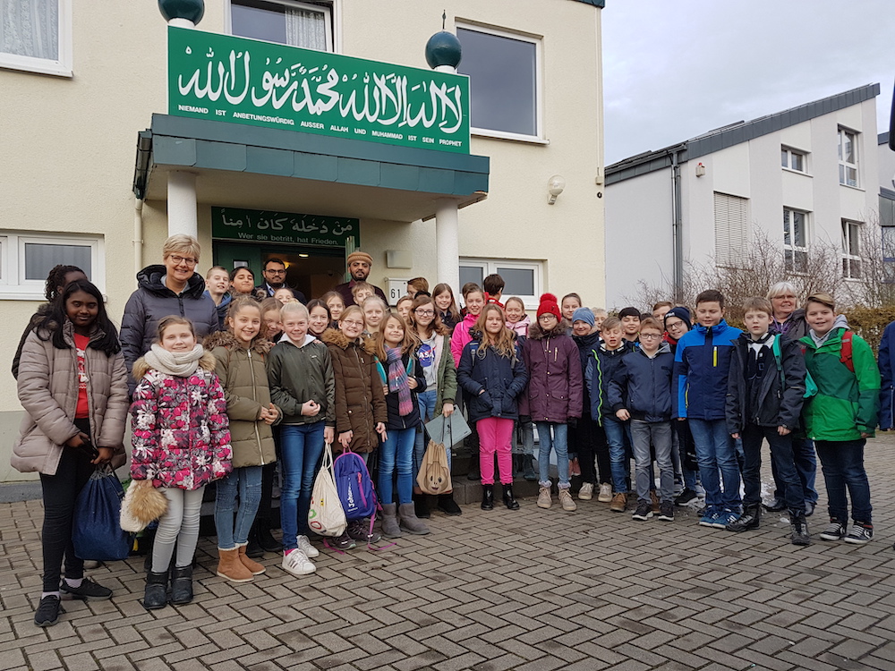 Auch die sich anschließenden zahlreichen Fragen der Fünftklässler wurden geduldig und anschaulich beantwortet, wie man an ihren Äußerungen erkennen kann. „Der Imam hat alle unserer Fragen beantwortet.“ (Toni), „Jetzt wissen wir mehr über den Islam“ (Vivian), „Die Moschee sah von außen so schön wie von innen aus“ (Leo), „Die Räume waren kleiner als ich gedacht habe“ (Laurin), „Der Imam hat unsere vielen Fragen ehrlich und gut beantwortet“ (Ildeniz), „Er hat einen spannenden und gut informierenden Film über seine Gemeinde gezeigt“ (Iljana), „Wie er seinen Gebetsruf vorgesungen hat, das hat mir am besten gefallen“ (Angelie). Besonders gut kam bei allen das Plakat „Wir sind alle Deutschland!“ an (Noel); ebenso das Motto „Liebe für alle – Hass für keinen!“ (Jan) und – kaum zu glauben: Kuchen für alle Kinder!